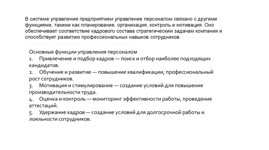 В системе управления предприятием управление персоналом связано с другимифункциями, такими как планирование, организация, контроль и мотивация. Оно