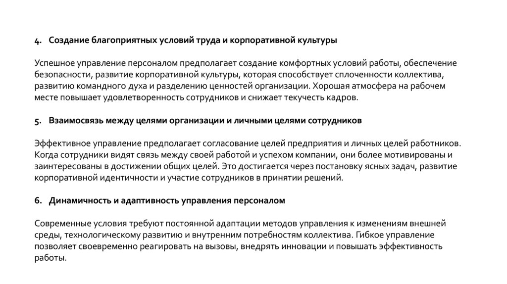 4. Создание благоприятных условий труда и корпоративной культурыУспешное управление персоналом предполагает создание комфортных условий работы, обеспечение