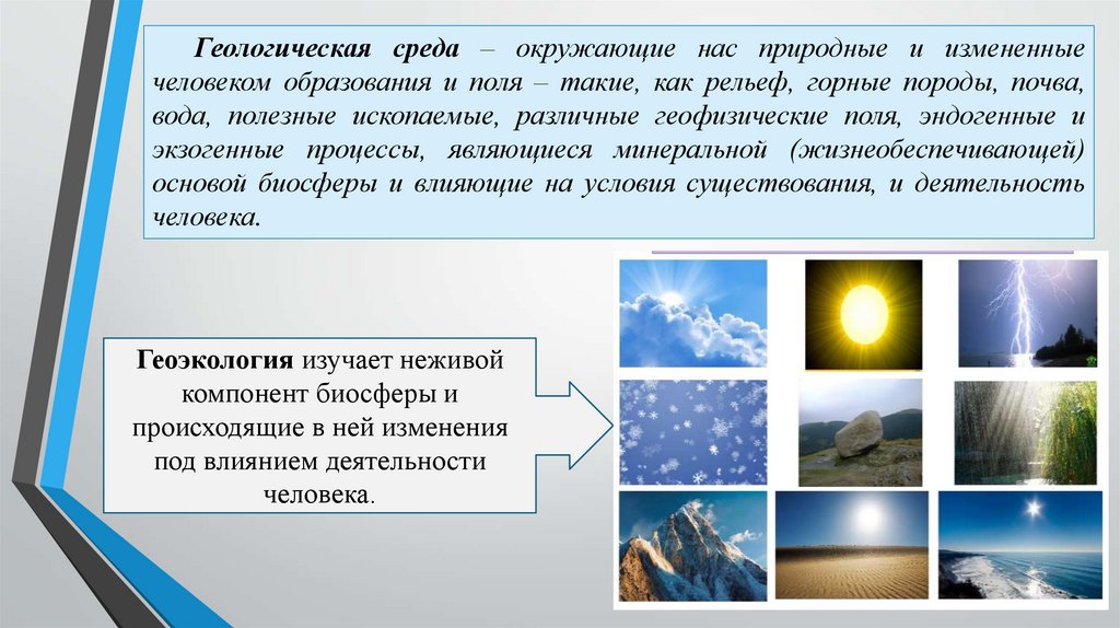 Геологическая среда – окружающие нас природные и измененныечеловеком образования и поля – такие, как рельеф, горные породы, почва,