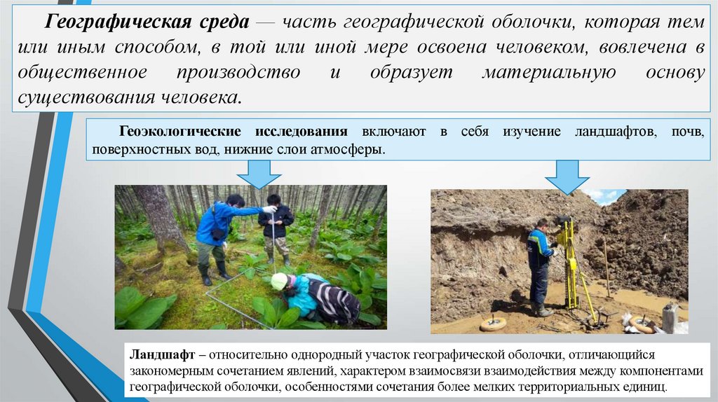 Географическая среда — часть географической оболочки, которая темили иным способом, в той или иной мере освоена человеком, вовлечена в