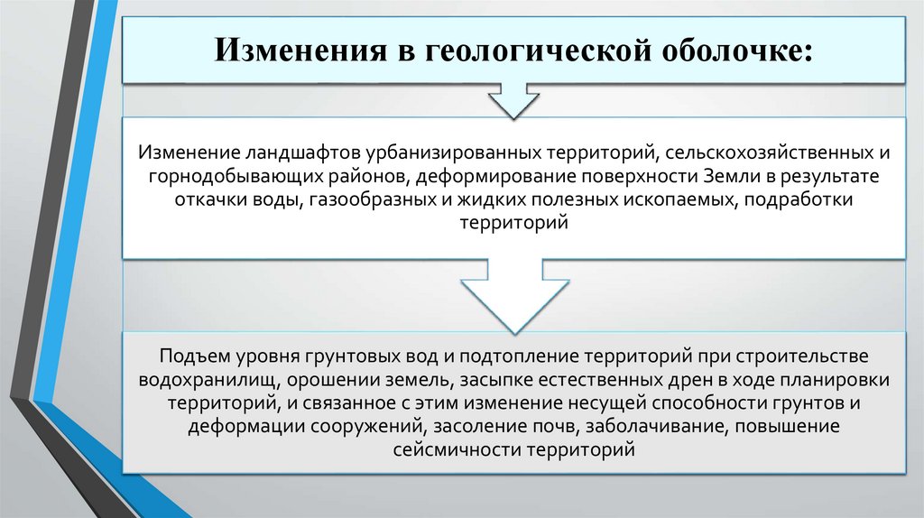 Изменения в геологической оболочке:Изменение ландшафтов урбанизированных территорий, сельскохозяйственных и