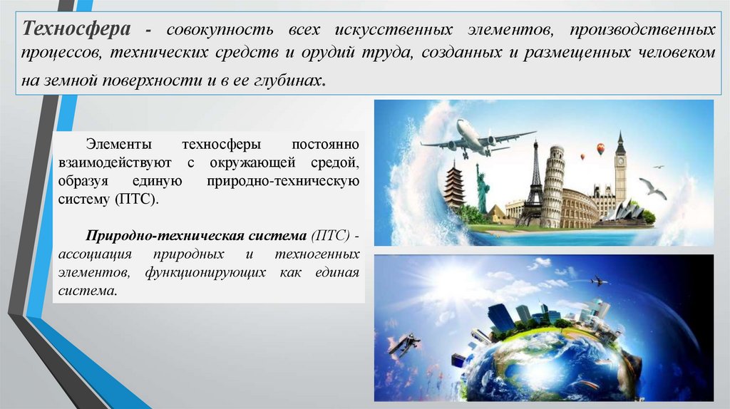 Техносфера - совокупность всех искусственных элементов, производственныхпроцессов, технических средств и орудий труда, созданных и размещенных человеком