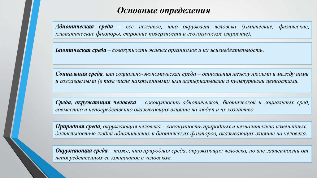 Основные определенияАбиотическая среда – все неживое, что окружает человека (химические, физические,