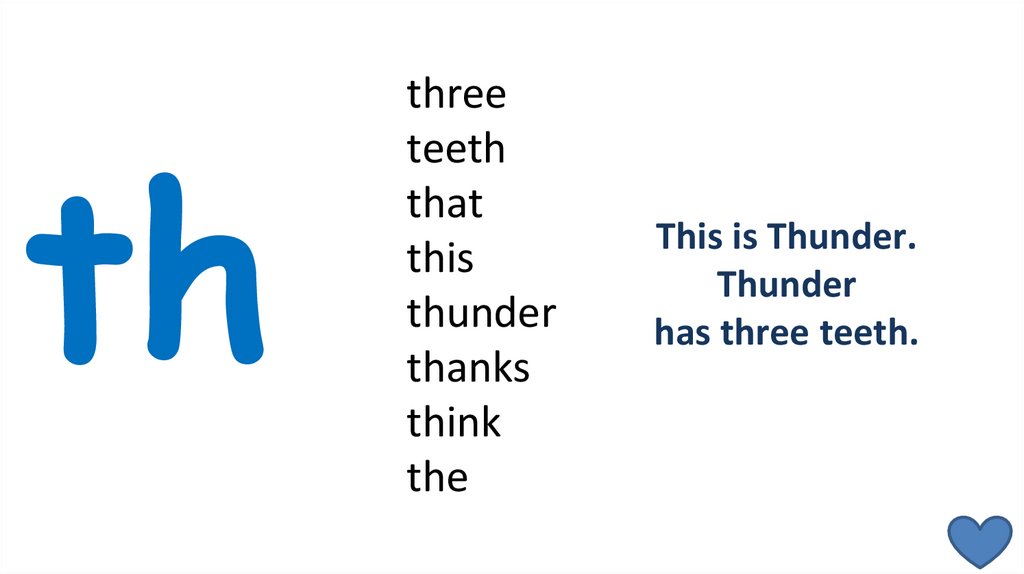 This, that, there, teeth, thunder, three, the, moth, math, those,these, path, thick, father, mother, brother