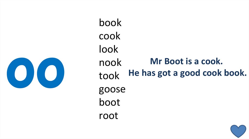 book, look, nook, zoom, doom, soon, cook, roof, stool, hook, Groot,
