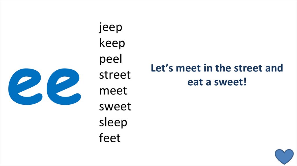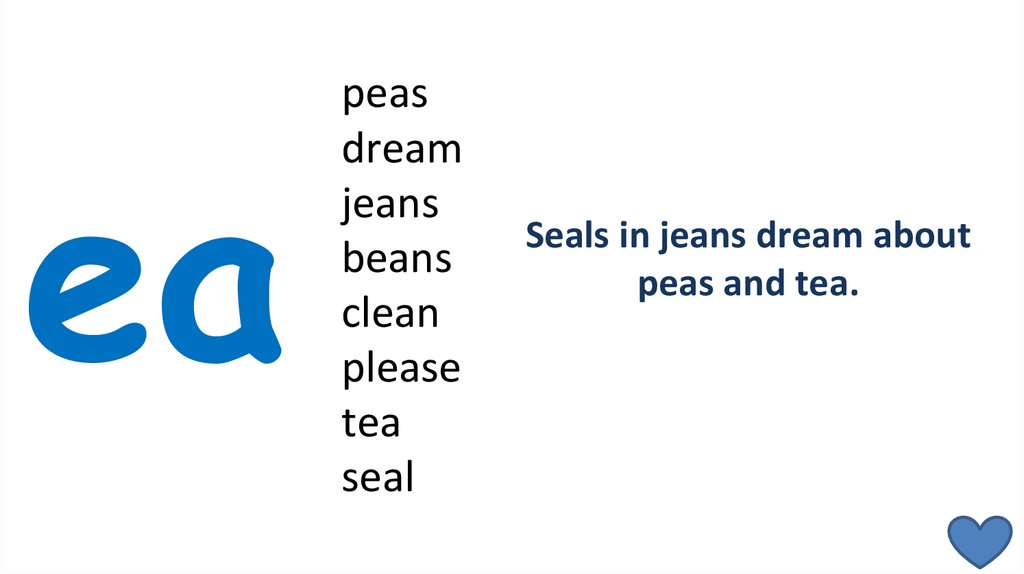 sneak, pea, please, jeans, leaf, dream, clean, read, tea, sea, seal,