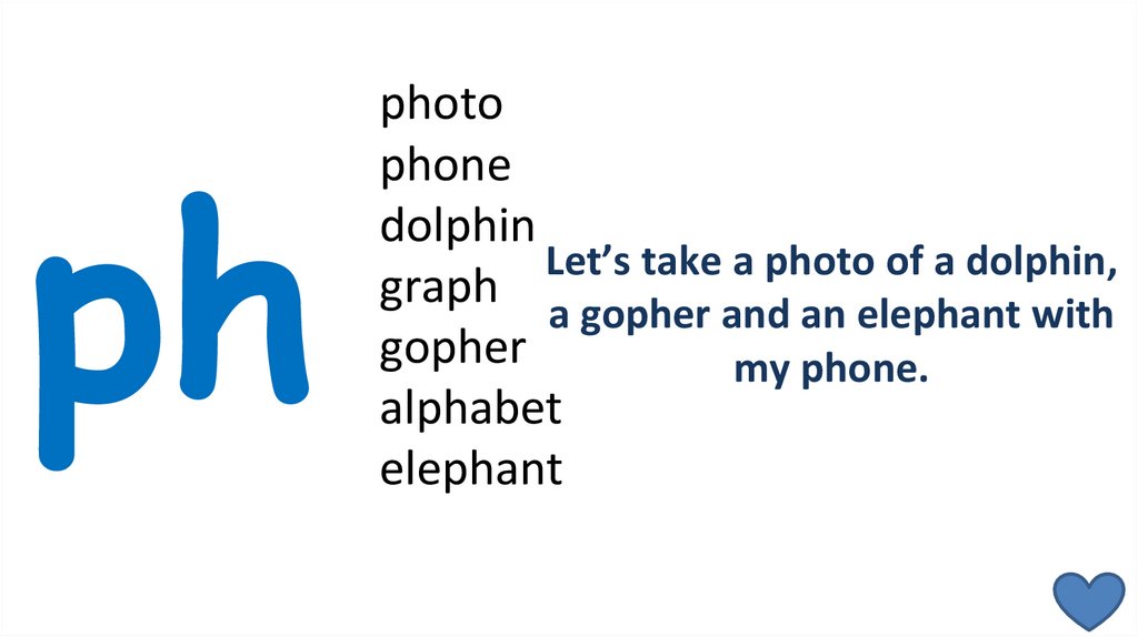Photo, phone, dolphin, elephant, gopher, graph, alphabet,