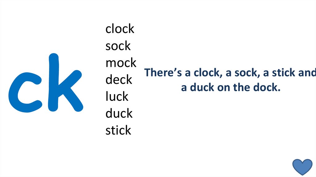clock, brick, lick, luck, chick, block, lock, sock, cock, duck, black, sack,