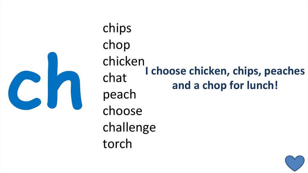 chips, chop, cheese, chair, chat, charm, chart, chick, chill, torch,