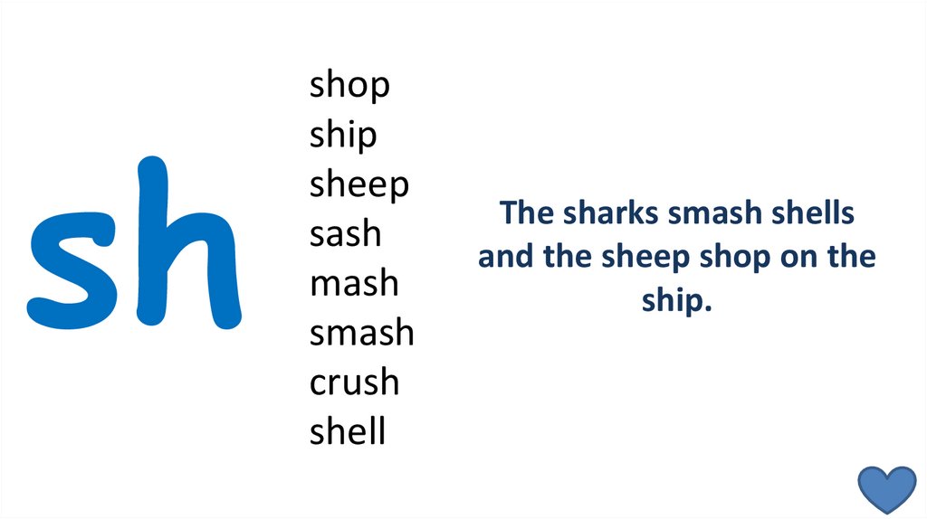 ship, shop, fish, shampoo, sheep, push, she, short, mash, sash, cash,shin, shed, shark, Shrek