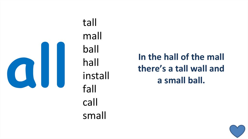 Tall, all, ball, hall, waterfall, install, mall, fall, wall, small, call