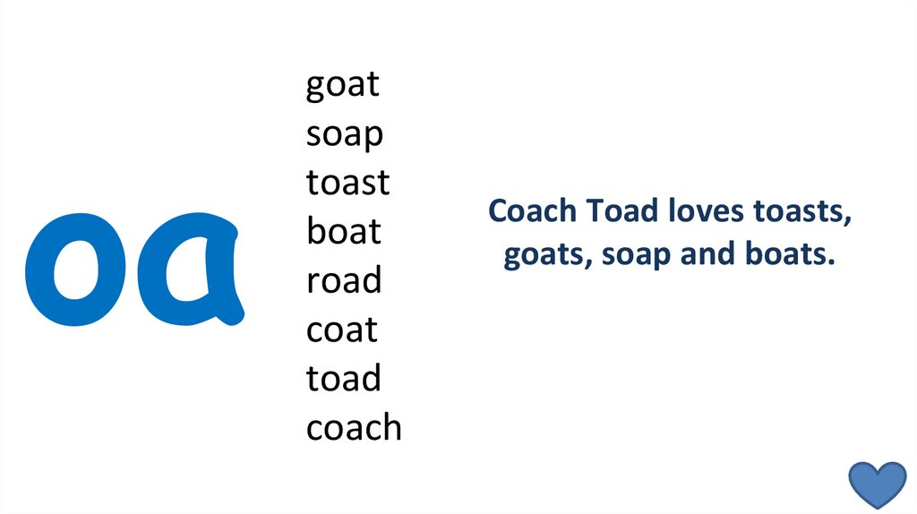 Goat, toad, boat, coat, soap, toast, coast, coach, oak, oats