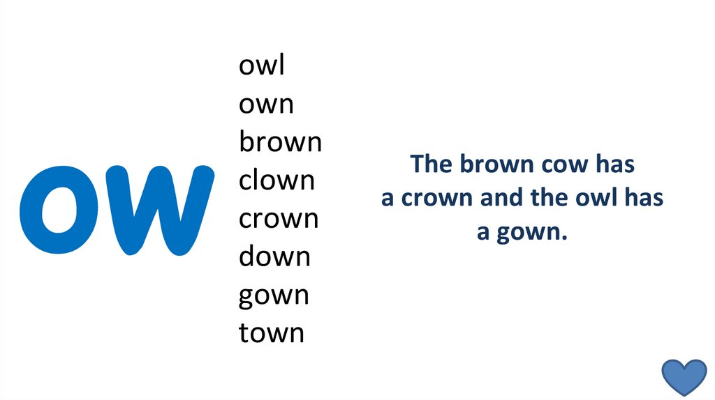 Cow, owl, brown, down, town, gown, clown, crown, howl, wow,