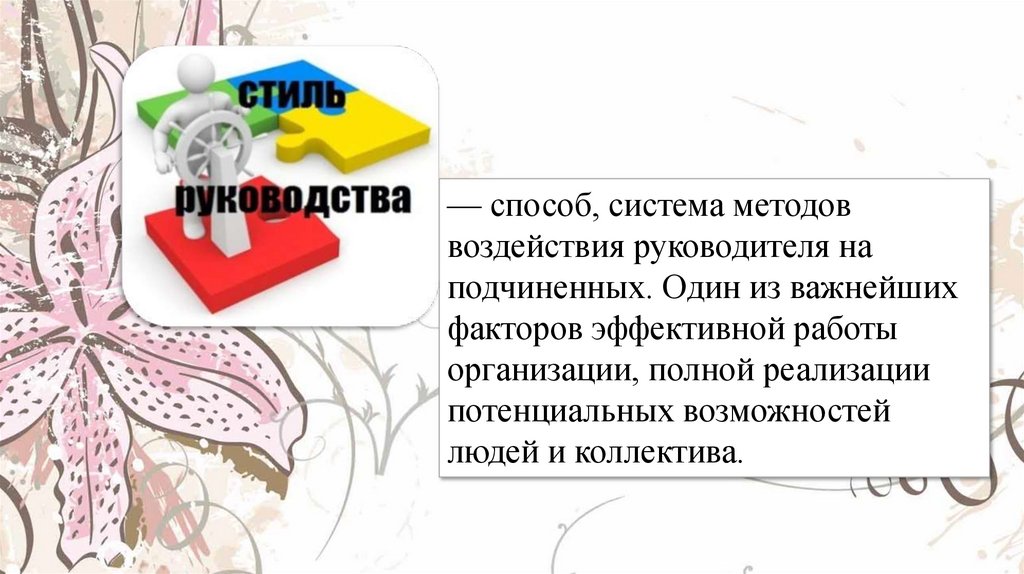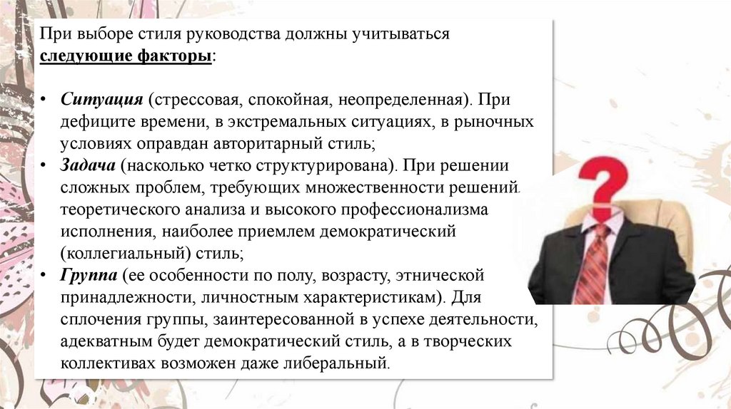 При выборе стиля руководства должны учитыватьсяследующие факторы: