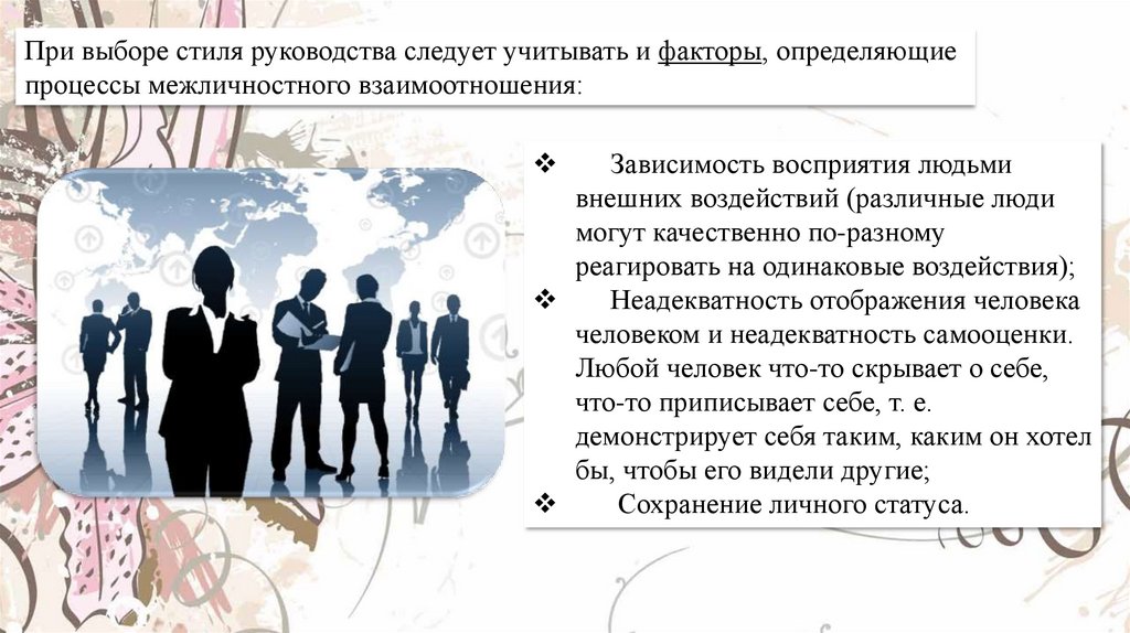 При выборе стиля руководства следует учитывать и факторы, определяющиепроцессы межличностного взаимоотношения: