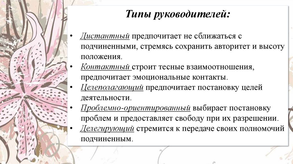 Типы руководителей:• Дистантный предпочитает не сближаться с