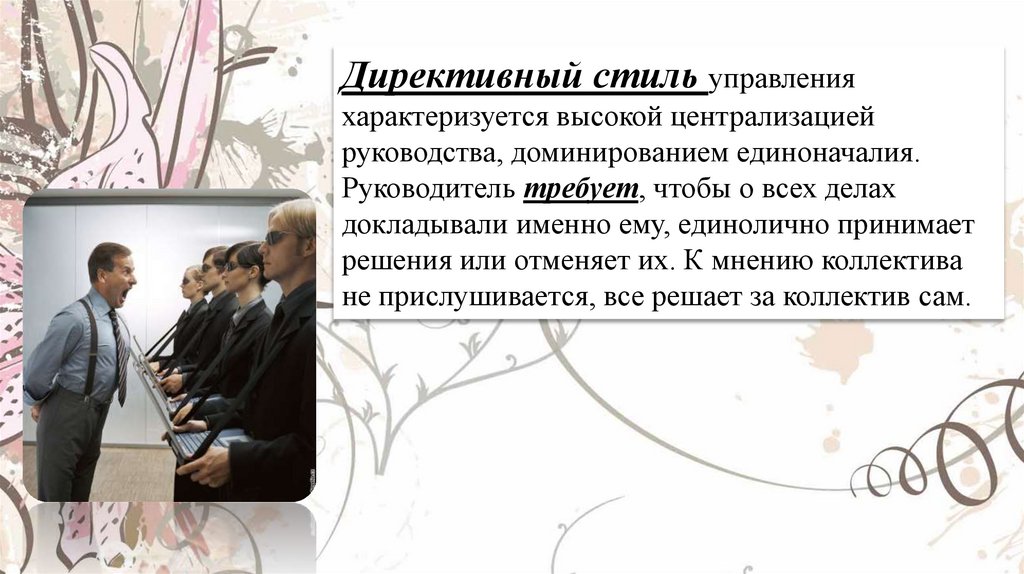 Директивный стиль управленияхарактеризуется высокой централизацией