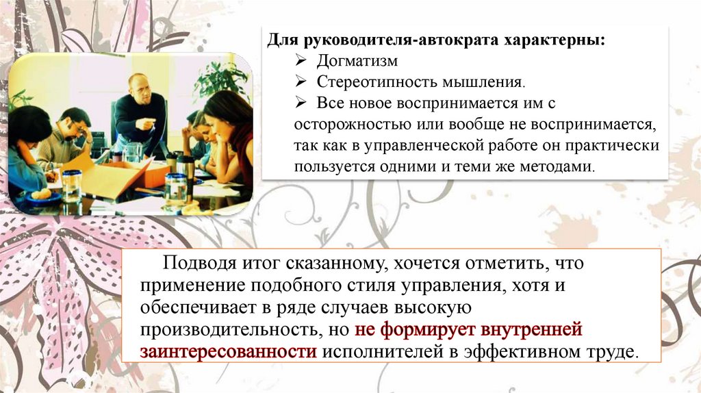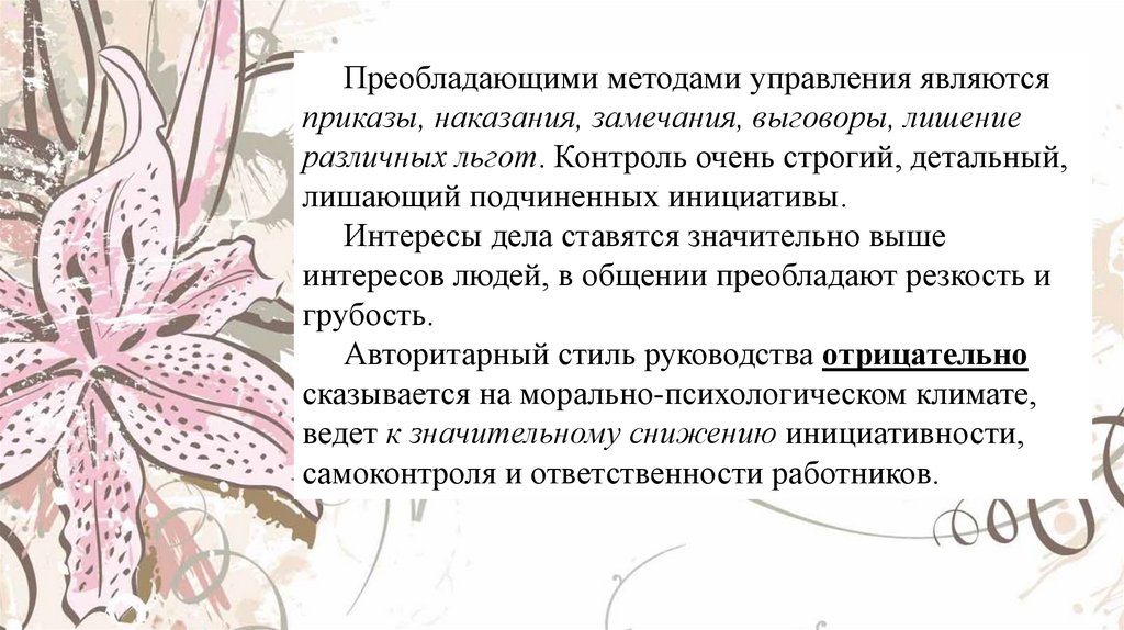 Преобладающими методами управления являютсяприказы, наказания, замечания, выговоры, лишение