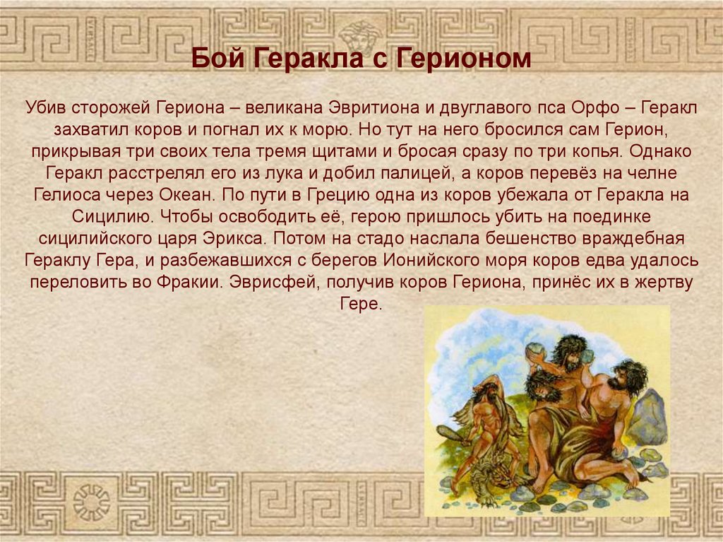Бой Геракла с ГериономУбив сторожей Гериона – великана Эвритиона и двуглавого пса Орфо – Геракл