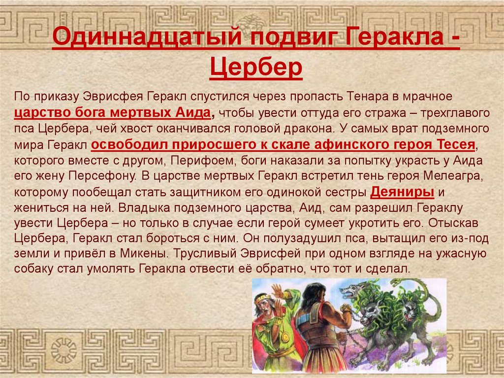 Одиннадцатый подвиг Геракла ЦерберПо приказу Эврисфея Геракл спустился через пропасть Тенара в мрачное