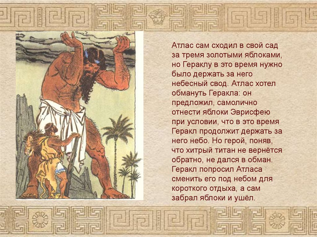 золотых яблока. Чтобы узнать путь к Атласу, Геракл