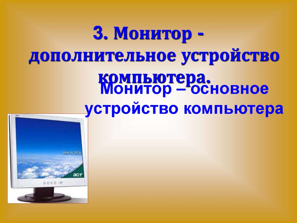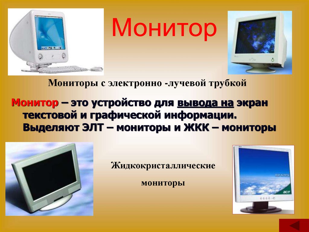 Выделяют ЭЛТ – мониторы и ЖКК – мониторы