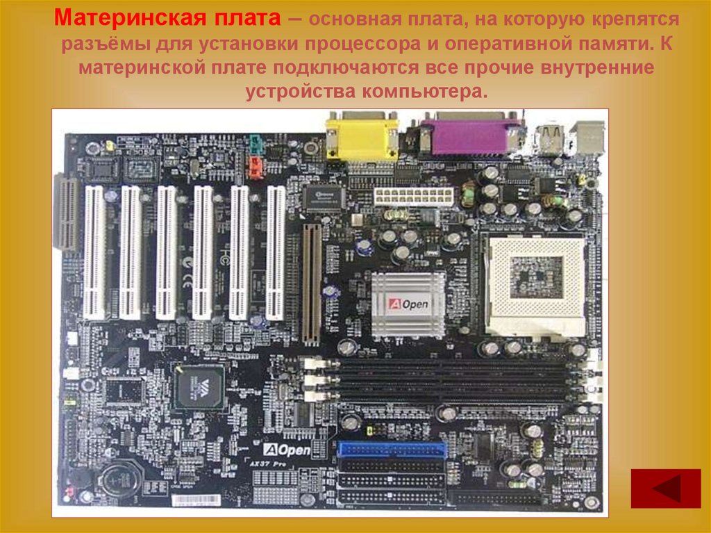 Материнская плата – основная плата, на которую крепятсяразъёмы для установки процессора и оперативной памяти. К
