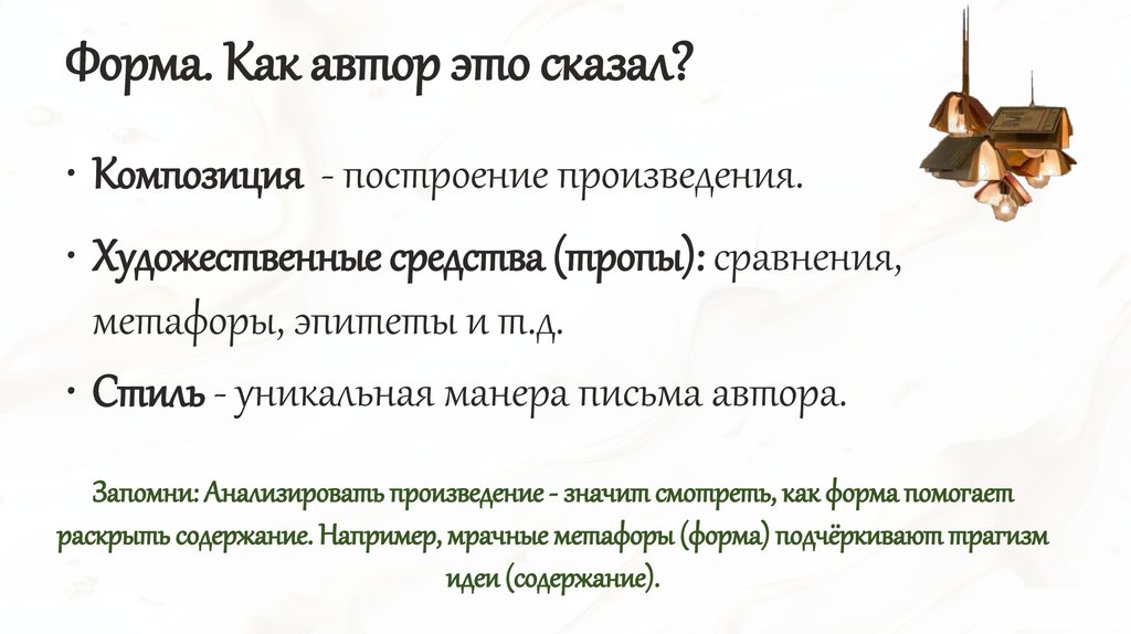 Запомни: Анализировать произведение - значит смотреть, как форма помогает