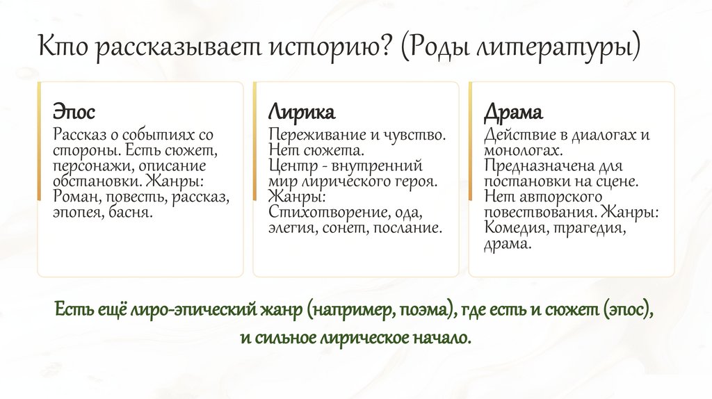 Есть ещё лиро-эпический жанр (например, поэма), где есть и сюжет (эпос),