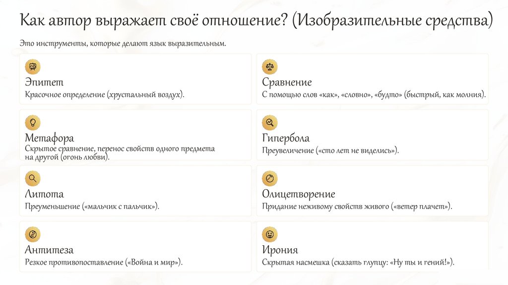 Как автор выражает своё отношение? (Изобразительные средства)Это инструменты, которые делают язык выразительным.