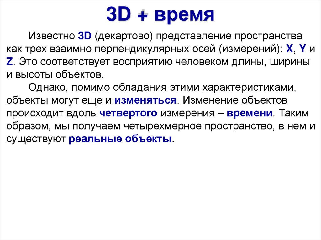 3D + времяИзвестно 3D (декартово) представление пространства