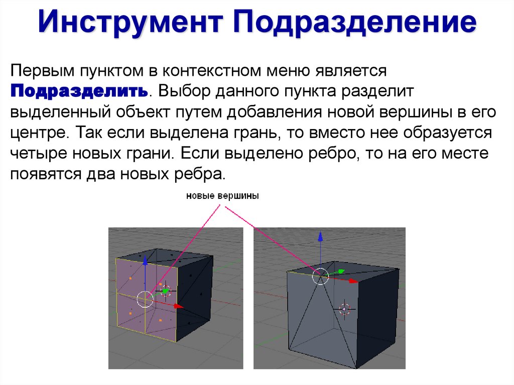 центре. Так если выделена грань, то вместо нее образуется