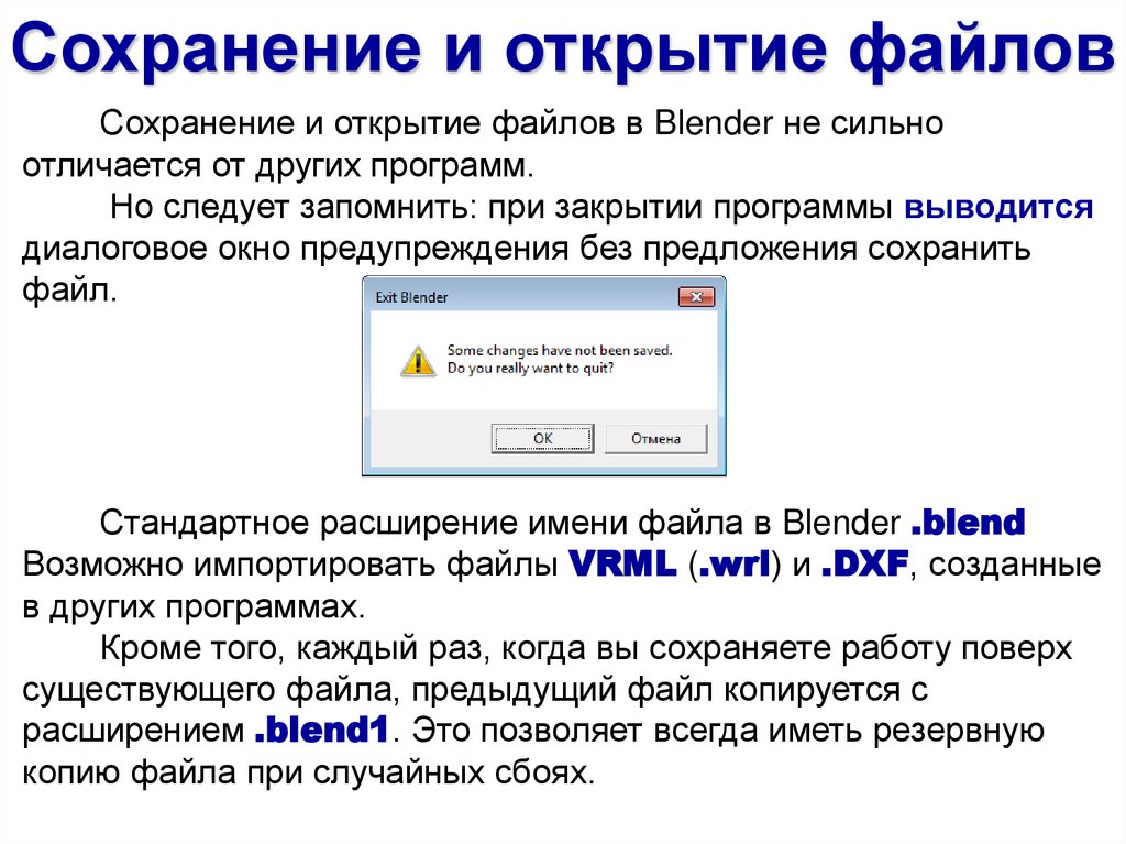 Сохранение и открытие файловСохранение и открытие файлов в Blender не сильно