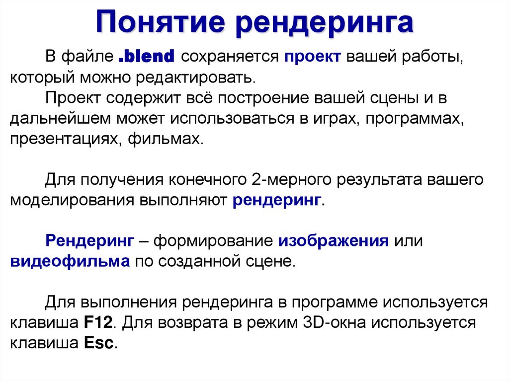 Понятие рендерингаВ файле .blend сохраняется проект вашей работы,
