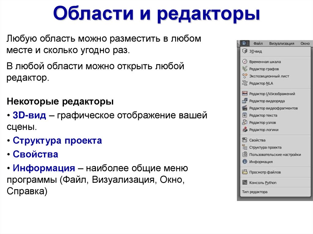 Области и редакторыЛюбую область можно разместить в любом
