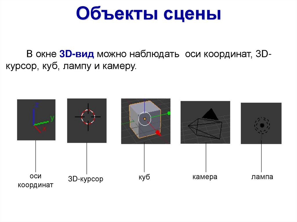 Объекты сценыВ окне 3D-вид можно наблюдать оси координат, 3Dкурсор, куб, лампу и камеру.