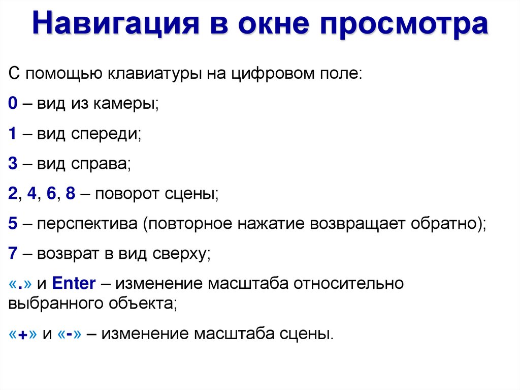 «+» и «-» – изменение масштаба сцены.