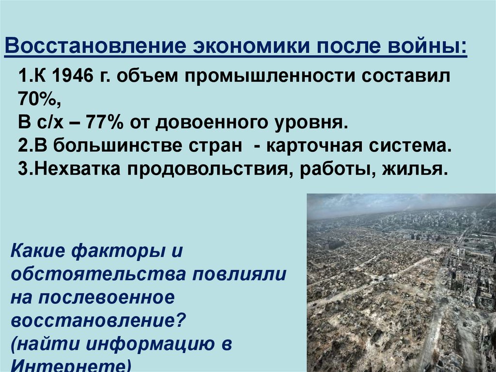 Восстановление экономики после войны:1.К 1946 г. объем промышленности составил