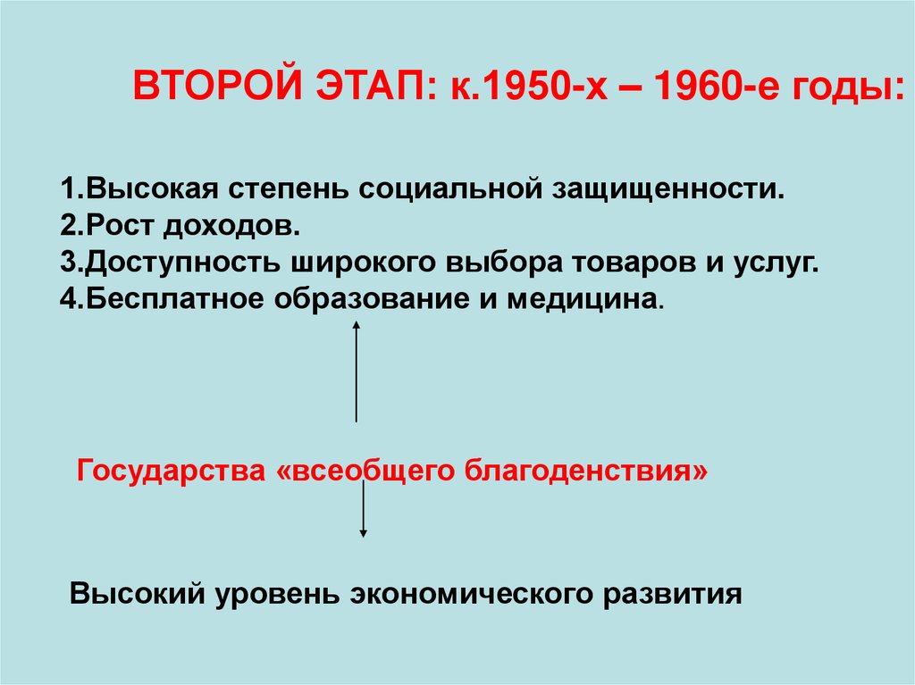 ВТОРОЙ ЭТАП: к.1950-х – 1960-е годы:1.Высокая степень социальной защищенности.