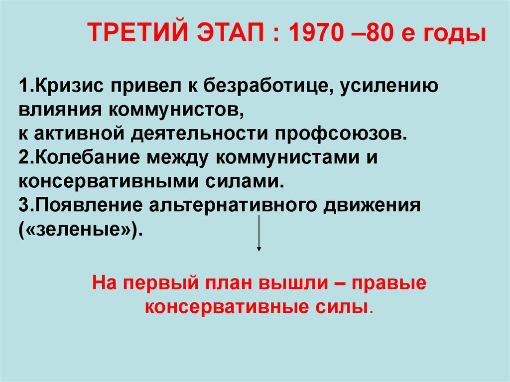 ТРЕТИЙ ЭТАП : 1970 –80 е годы1.Кризис привел к безработице, усилению