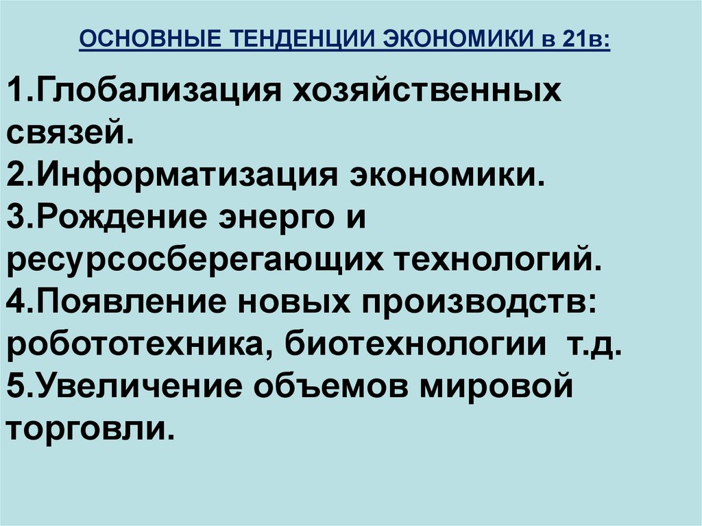 ОСНОВНЫЕ ТЕНДЕНЦИИ ЭКОНОМИКИ в 21в:1.Глобализация хозяйственных
