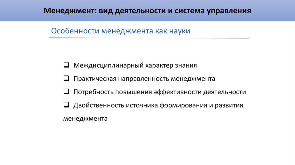 Менеджмент: вид деятельности и система управленияОсобенности менеджмента как науки