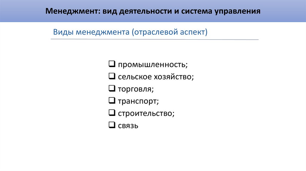 Менеджмент: вид деятельности и система управленияВиды менеджмента (отраслевой аспект)