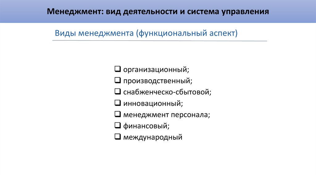Менеджмент: вид деятельности и система управленияВиды менеджмента (функциональный аспект)