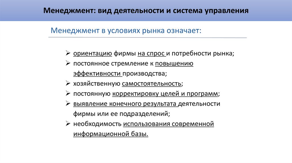 Менеджмент: вид деятельности и система управленияМенеджмент в условиях рынка означает: