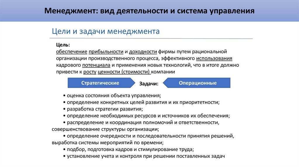 Менеджмент: вид деятельности и система управленияЦели и задачи менеджмента