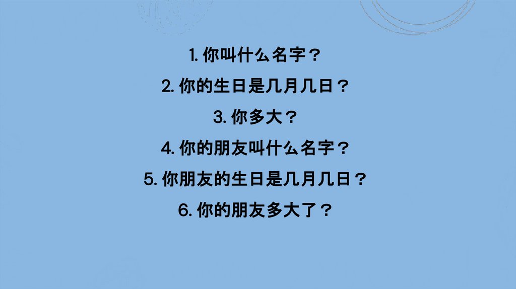 1. 你叫什么名字2. 你的生日是几月几日