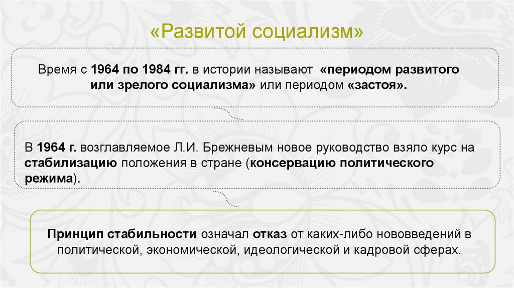 «Развитой социализм»Время с 1964 по 1984 гг. в истории называют «периодом развитого