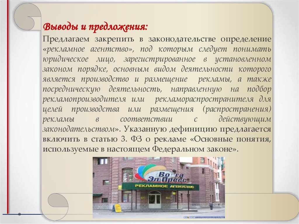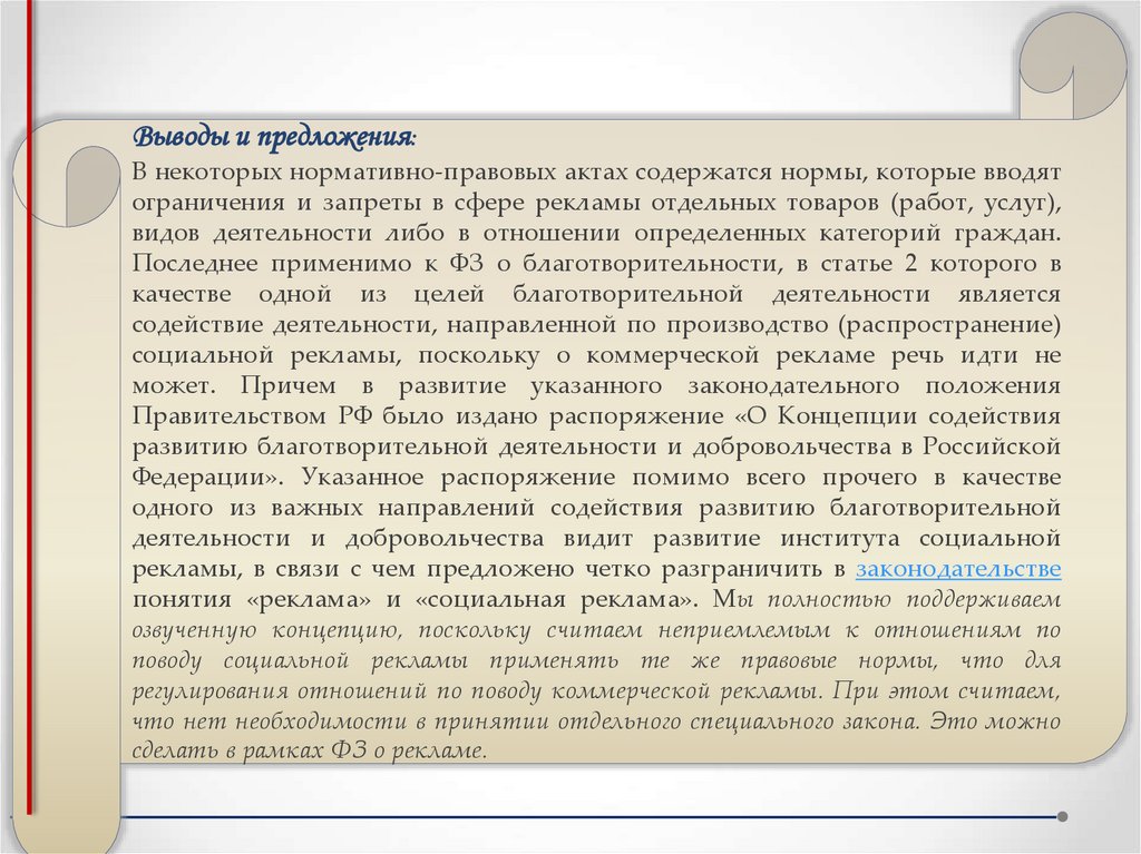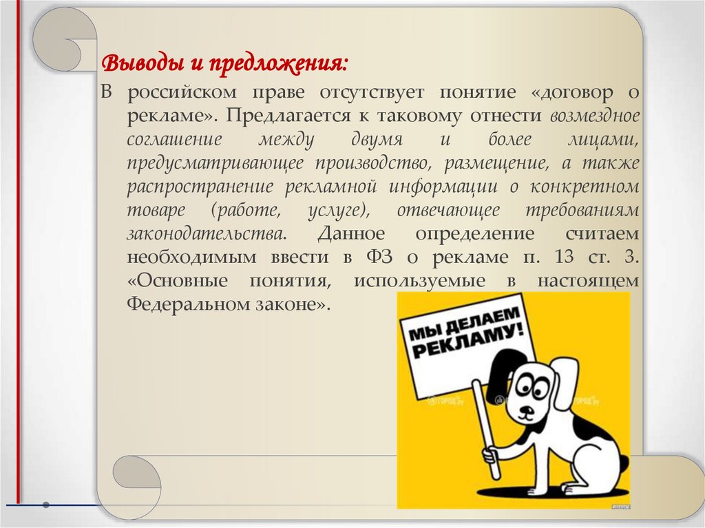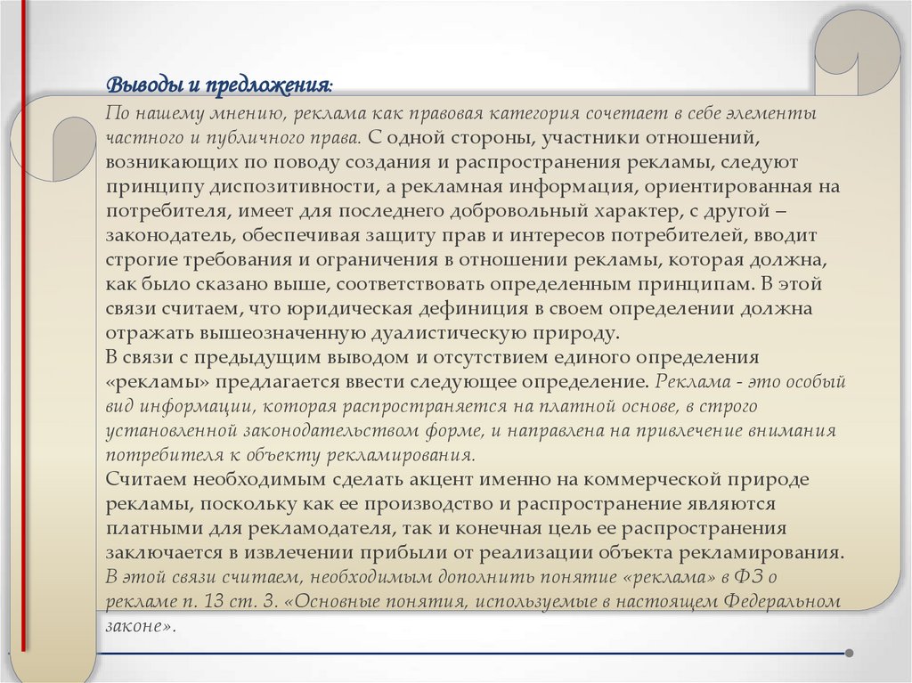 Выводы и предложения:По нашему мнению, реклама как правовая категория сочетает в себе элементы