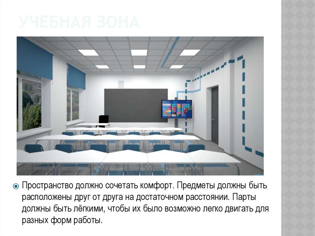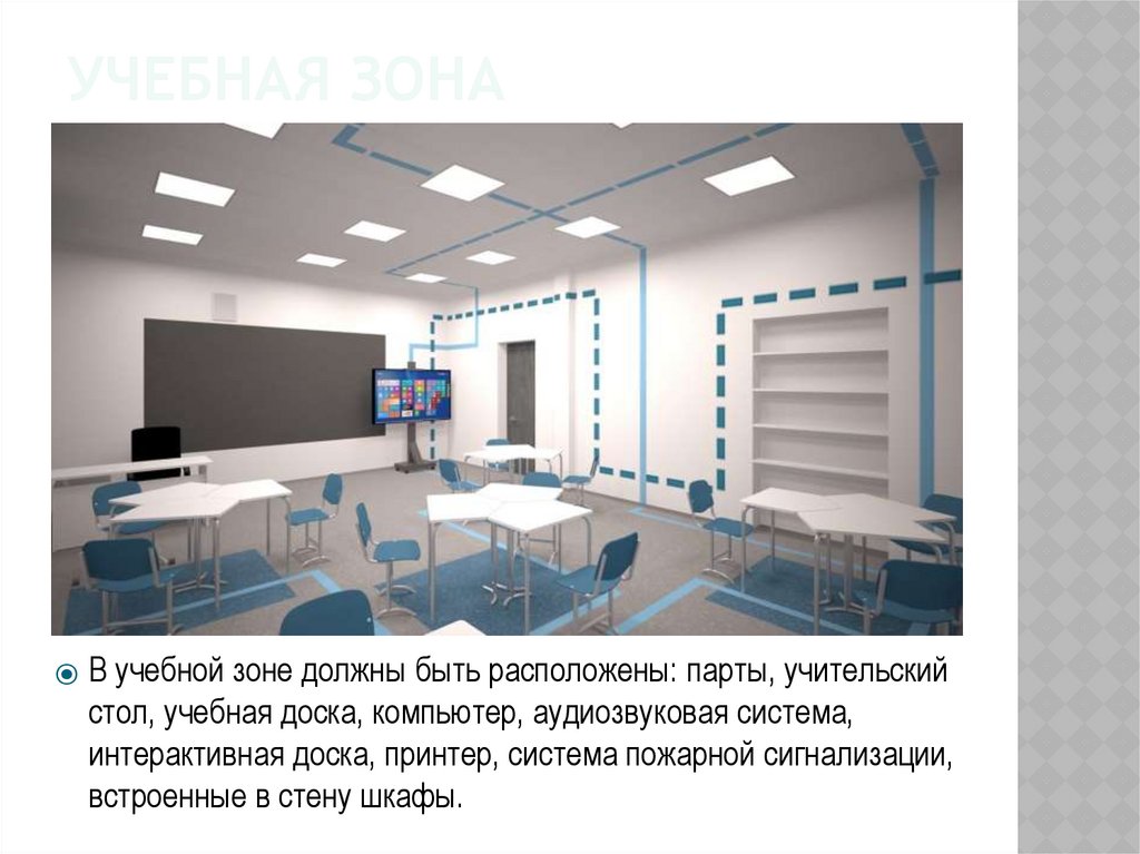 УЧЕБНАЯ ЗОНА⦿ В учебной зоне должны быть расположены: парты, учительский